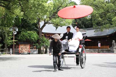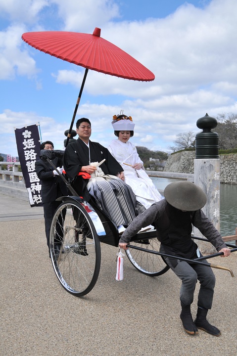 約5年ぶりにお目見えとなった世界遺産姫路城。姫路城からも近い位置にある白鷺宮から人力車で周遊をされた新郎様と新婦様。観光客の皆様から「おめでとう」との祝福のお言葉を受けお二人やご親族様もとても喜ばれておりました。